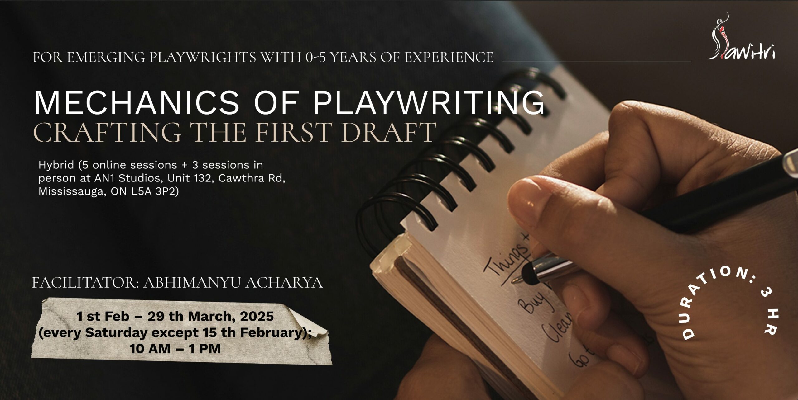 Who is the facilitator? Dr. Abhimanyu Acharya is an award-winning playwright and fiction writer. He has been trained at, supported by and/or has collaborated with the following theatre companies: MT Space (Kitchener), Boca Del Lupo (Vancouver), SAWITRI Theatre (Mississauga), Red Beti Theatre (Hamilton), Grand Theatre (London, ON), First Steps Theatre (London, ON), Indian Ensemble (Bangalore), Bhasha Centre (Bangalore), Rage Theatre (Mumbai), Studio Tamasha (Mumbai), Triveni Theatre (Ahmedabad). His plays have been performed in different cities in the U.S., Canada, and India. He has won the Majdi Bou-Matar Bursary, Brecht 2023 commission, Read at the Fringe contest at Eden Mills Writers Festival, Sanhita Manch Playwriting Award, and Sahapedia-UNESCO fellowship, amongst others. He is a postdoctoral associate at Western University, and Creative Writing Specialist at Kings University College in London, Ontario.